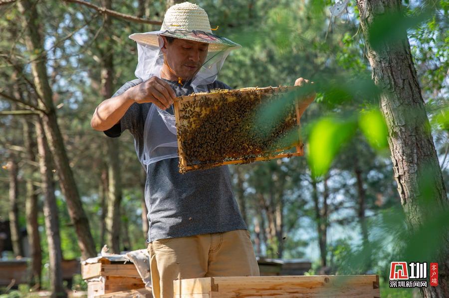 2020年5月3日,湖北省襄陽市,在南漳三道河水庫小島上,小島養(yǎng)蜂人趙德海每天要巡視蜂箱,查看蜂箱的蜜蜂密集度和蜜蜂繁殖情況,及時(shí)調(diào)整,才能避免蜜蜂受損。