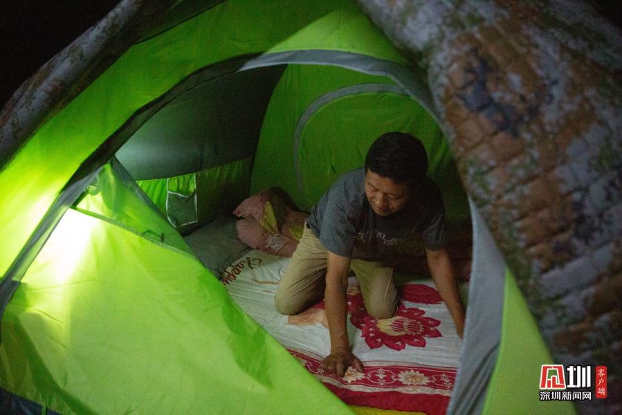 2020年5月3日,湖北省襄陽市,在南漳三道河水庫小島上,小島養(yǎng)蜂人趙德海忙碌了一天,晚上收拾帳篷準備在島上入睡。