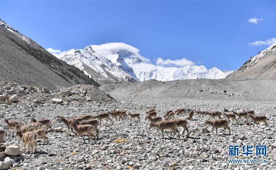 一群巖羊在珠峰大本營附近覓食(5月8日攝)。當(dāng)日,一群巖羊在珠峰大本營周圍覓食,黃嘴山鴉飛到巖羊身上停留,構(gòu)成一幅幅生動(dòng)有趣的雪域圖畫。新華社記者普布扎西攝