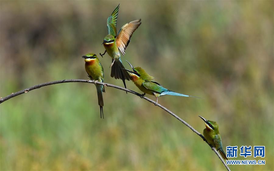 在海口五源河下游蜂虎保護小區(qū),栗喉蜂虎在嬉戲(5月7日攝)。新華社記者楊冠宇攝