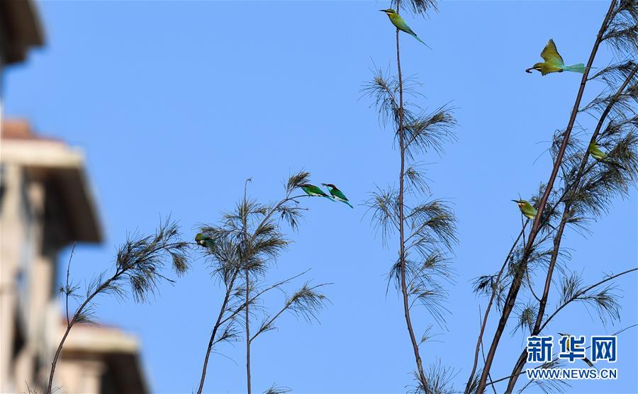 5月8日,在海口五源河下游蜂虎保護(hù)小區(qū),栗喉蜂虎和藍(lán)喉蜂虎在樹枝上休息。新華社記者楊冠宇攝