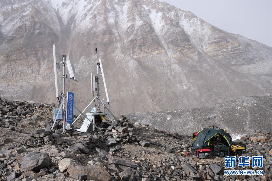 過渡營地附近的中國移動(dòng)基站(5月8日攝)。珠峰過渡營地海拔5800米,是連接前進(jìn)營地和珠峰大本營的重要一站。登山愛好者從大本營徒步大約四個(gè)小時(shí)就能抵達(dá)過渡營地。此段路程亂石林立,同時(shí)也能欣賞壯美的冰川。新華社記者孫非攝