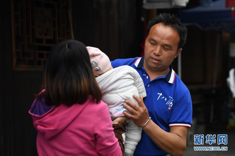 施六金(右)從妻子手中接過兒子施澤恩(4月25日攝)。1973年出生于十八洞村的施六金,由于父親患病很早就放棄學業(yè)和母親扛起了家庭的重擔。為了生活,他還曾遠去東南亞打工。2015年,看到家鄉(xiāng)的變化,施六金回到村里開起了農(nóng)家樂,年度家庭人均純收入也從2014年的1715元增長到了2019年的35696元。2018年,施六金與心愛的人組建了家庭。今年初,施六金與愛人迎來了一個大胖小子?!白鋈俗鍪乱没貓蠛透卸鳌!笔┝鸾o剛出生的兒子取名施澤恩。新華社記者薛宇舸攝