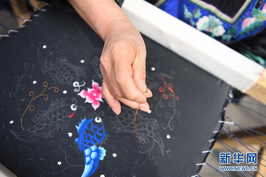 吳美金(右一)在十八洞村苗繡特產(chǎn)農(nóng)民專業(yè)合作社繡苗繡(4月24日攝)。1967年出生的吳美金,1992年嫁入飛蟲村(現(xiàn)十八洞村飛蟲寨)時,只有爛泥路的飛蟲村不僅田土少,掙錢活路也少,生活十分困難。2014年,吳美金加入了十八洞村苗繡特產(chǎn)農(nóng)民專業(yè)合作社,從小就會的苗繡傳統(tǒng)手藝如今成了家庭增收的法寶,不僅在家門口就把錢掙了,同時還能照顧年幼的孫子孫女。“現(xiàn)在的日子,比年輕的時候好多了?!眳敲澜鹫f。新華社記者薛宇舸攝