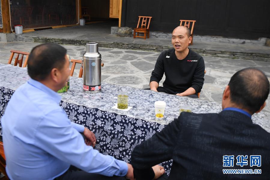 楊正邦(中)在和來自浙江的住客攀談(4月25日攝)。楊正邦1978年出生于十八洞村,在外打工多年。近些年,眼看來十八洞村的游客越來越多,村里越來越熱鬧,楊正邦在2017年結(jié)束自己的打工生涯回鄉(xiāng)發(fā)展。他先是在村里擺起小吃攤,2018年開起農(nóng)家樂,去年又搭起新房子擴建成民宿,年度家庭人均純收入從2014年的1923元增加到2019年的7173元。新華社記者薛宇舸攝