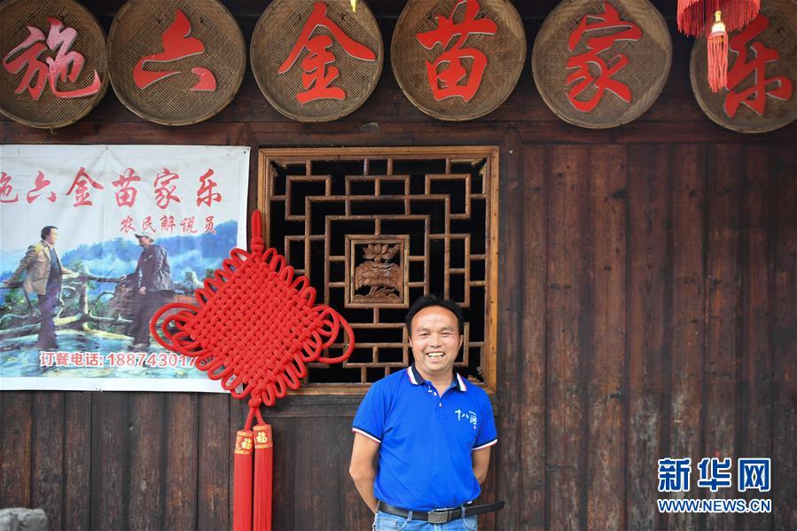 這是施六金在他的農家樂前留影(4月25日攝)。1973年出生于十八洞村的施六金,由于父親患病很早就放棄學業(yè)和母親扛起了家庭的重擔。為了生活,他還曾遠去東南亞打工。2015年,看到家鄉(xiāng)的變化,施六金回到村里開起了農家樂,年度家庭人均純收入也從2014年的1715元增長到了2019年的35696元。2018年,施六金與心愛的人組建了家庭。今年初,施六金與愛人迎來了一個大胖小子。“做人做事要懂得回報和感恩。”施六金給剛出生的兒子取名施澤恩。新華社記者薛宇舸攝