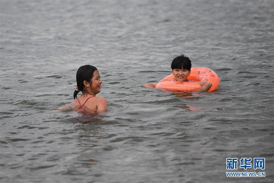 5月10日,市民在海口西秀海灘海域戲水。近日,??诔掷m(xù)高溫,不少市民前往海灘戲水消暑。新華社記者蒲曉旭攝