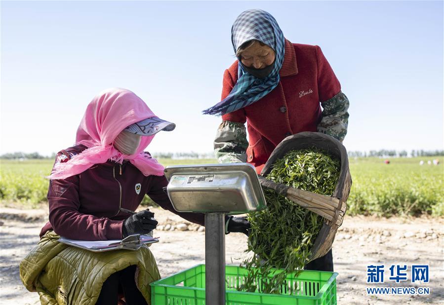 5月11日,在寧夏百瑞源賀蘭山基地,工作人員對(duì)采摘的枸杞芽茶進(jìn)行稱重。當(dāng)日,寧夏百瑞源賀蘭山基地枸杞芽茶全面進(jìn)入采摘季。據(jù)了解,該基地茶園面積300余畝,助力附近200多名農(nóng)民就業(yè)增收。新華社記者楊植森攝
