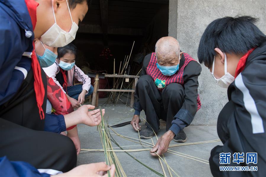 5月12日,浙江諸暨龍溪村的百歲老人蔡渭東在家中為小學生講解篾器編法。浙江諸暨東和鄉(xiāng)龍溪村有一位102歲的老人蔡渭東,他從12歲開始拜師學藝,做了90年的篾匠,如今依然耳聰目明,每天堅持編織篾器。蔡渭東老人說他舍不得丟掉這份老手藝,也希望年輕人能傳承下去。新華社記者翁忻旸攝