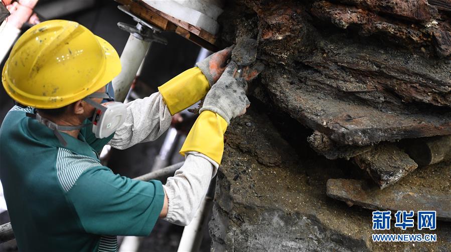 在廣東陽江海陵島,工作人員在“南海I號”發(fā)掘現(xiàn)場進(jìn)行清理工作(5月12日攝)。新華社記者鄧華攝