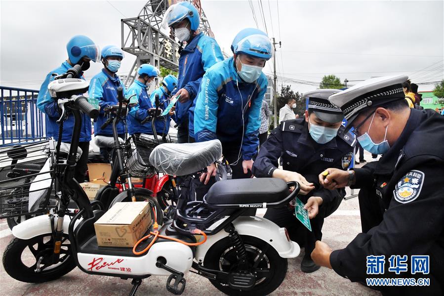 5月14日,青島市李滄交警部門民警為一外賣企業(yè)員工集中辦理電動自行車掛牌。新華社記者李紫恒攝
