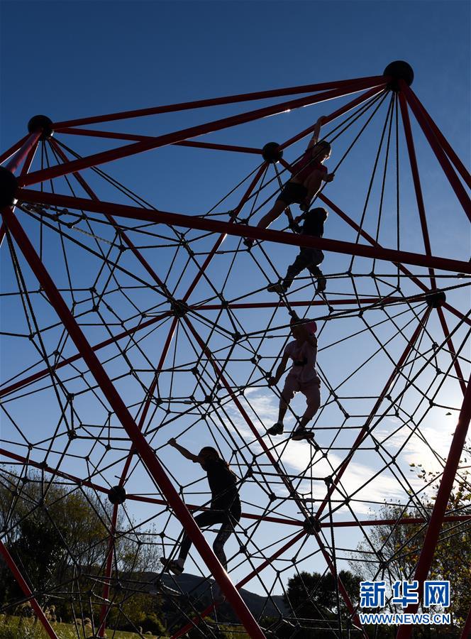5月14日,孩子們在首都惠靈頓郊外公園的游樂場玩耍。當天是新西蘭從新冠疫情防控響應三級下調到二級的第一天,經濟活動全面重啟,公園等公共設施首次重新開放,中小學生將于5月18日全面返校復課。新華社記者郭磊攝