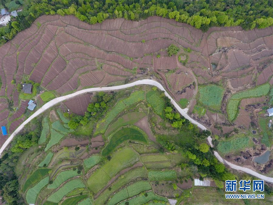 這是4月1日拍攝的龍臺(tái)村部分土地(無人機(jī)照片)。圖中上半部分為已種上中藥材的新整土地,下半部分為該村種植的傳統(tǒng)作物。新華社記者劉坤攝