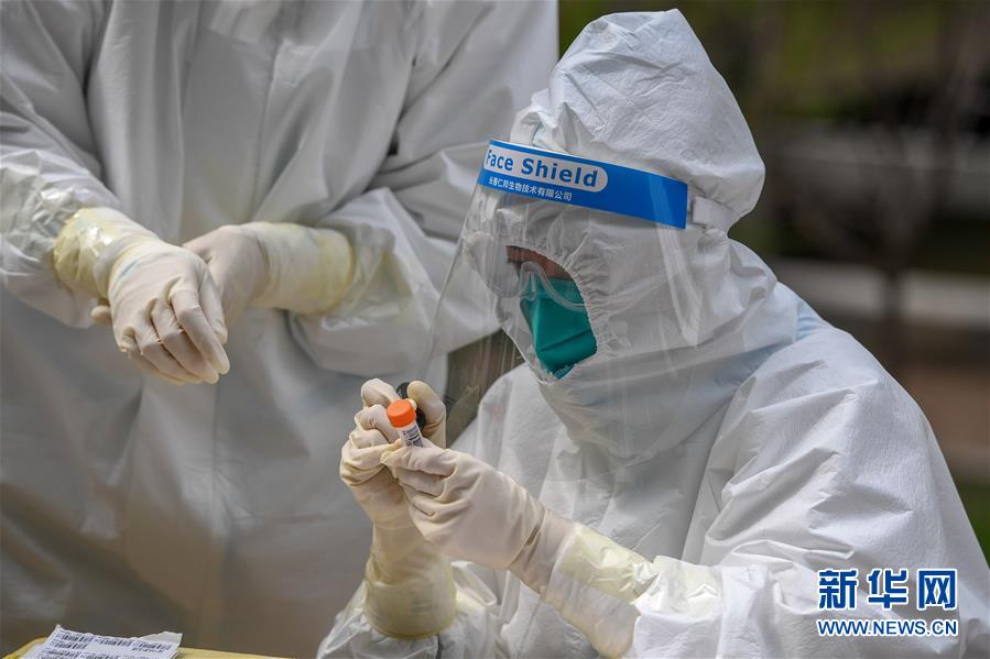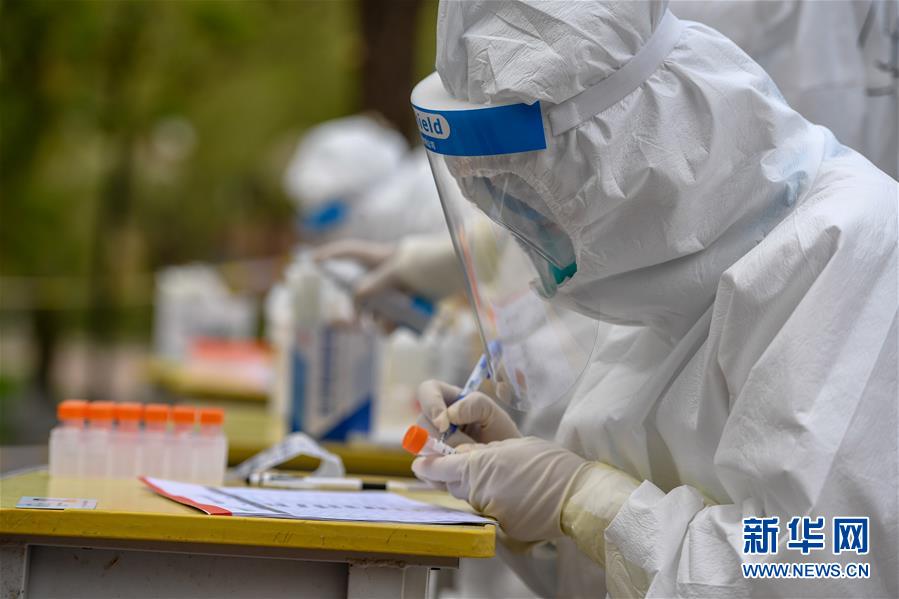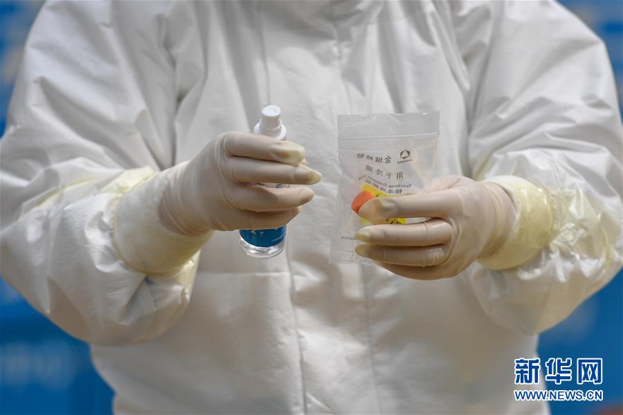 5月15日,在舒蘭市建馨園小區(qū),工作人員進(jìn)行采樣準(zhǔn)備工作。當(dāng)日,從吉林市7家市直醫(yī)院抽調(diào)的300名護(hù)士經(jīng)培訓(xùn)后,全部投入到舒蘭市(隸屬于吉林市)核酸采樣工作中。為提供追溯傳染源所必需的核酸檢測(cè)相關(guān)數(shù)據(jù),舒蘭市根據(jù)確診病例的活動(dòng)軌跡,將流調(diào)和核酸檢測(cè)范圍擴(kuò)大至本地確診病例和無癥狀感染者的次密接人員及一般接觸者。新華社記者張楠攝
