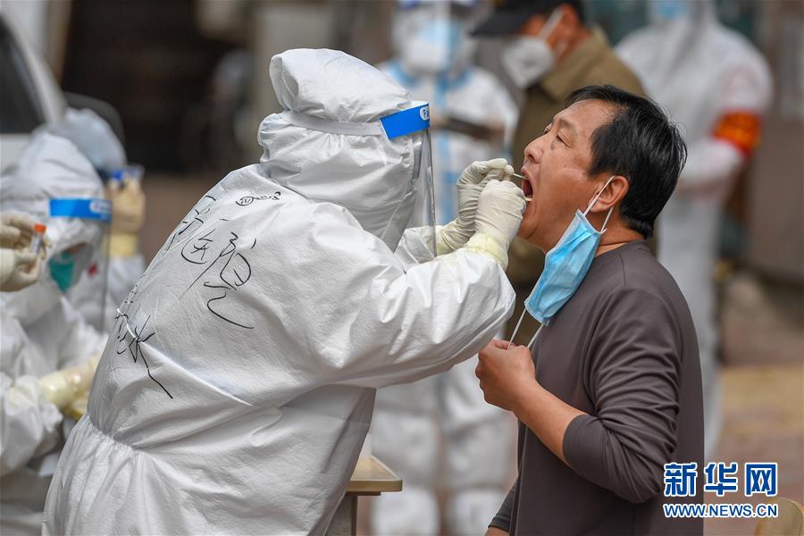 5月15日,在舒蘭市建馨園小區(qū),工作人員為居民采集咽拭子。當(dāng)日,從吉林市7家市直醫(yī)院抽調(diào)的300名護(hù)士經(jīng)培訓(xùn)后,全部投入到舒蘭市(隸屬于吉林市)核酸采樣工作中。為提供追溯傳染源所必需的核酸檢測(cè)相關(guān)數(shù)據(jù),舒蘭市根據(jù)確診病例的活動(dòng)軌跡,將流調(diào)和核酸檢測(cè)范圍擴(kuò)大至本地確診病例和無癥狀感染者的次密接人員及一般接觸者。新華社記者張楠攝