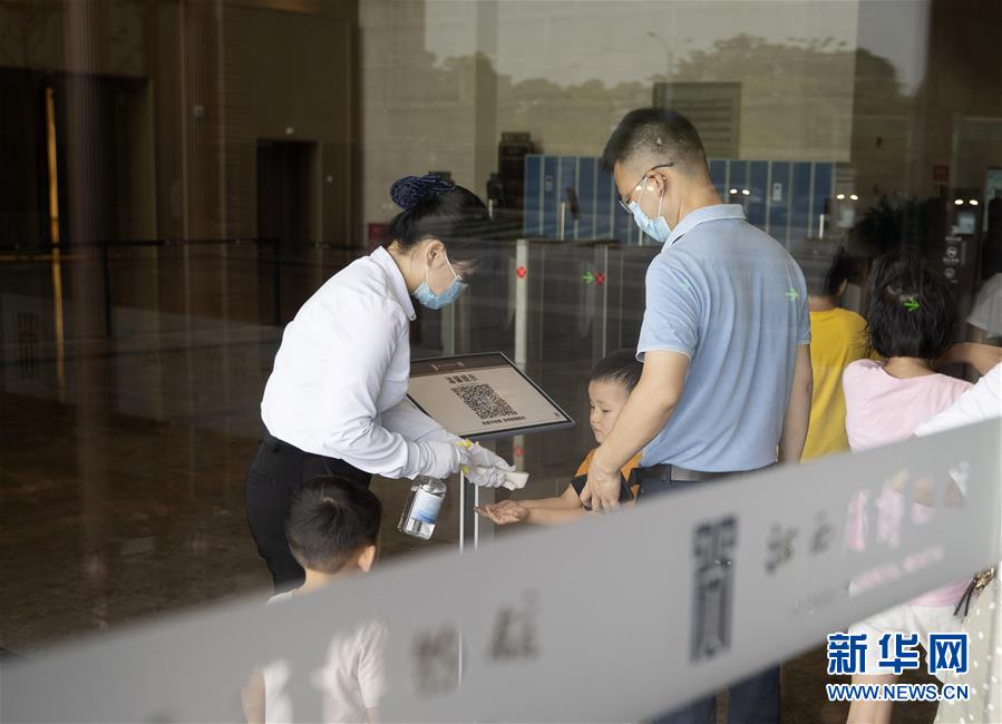 5月17日,在江西省博物館新館,參觀者入館前測量體溫。江西省博物館新館在做好疫情防控的前提下有序開放,公眾可通過網(wǎng)上預(yù)約參觀游覽。新華社記者張浩波攝