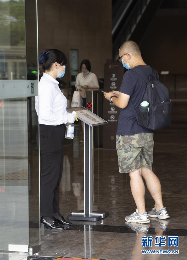 5月17日,在江西省博物館新館,參觀者入館前掃描“健康碼”。江西省博物館新館在做好疫情防控的前提下有序開放,公眾可通過網(wǎng)上預(yù)約參觀游覽。新華社記者張浩波攝