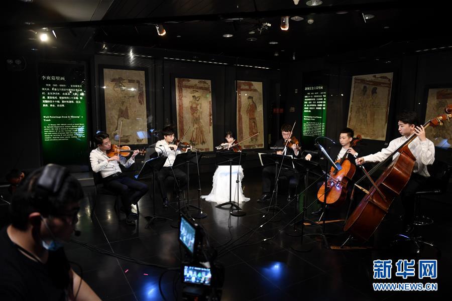 在陜西歷史博物館唐代壁畫珍品館,西安交響樂團(tuán)小提琴首席周虎翼、第二小提琴首席白東旭、第二小提琴演奏員葉姣睿、中提琴演奏員時少愷、大提琴演奏員于丁和低音提琴演奏員趙子杰(從左至右)為“云上國寶”音樂會彩排(5月14日攝)。為迎接國際博物館日,5月14日,西安交響樂團(tuán)走進(jìn)陜西歷史博物館唐代壁畫珍品館,為5月18日的“云上國寶”音樂會彩排。觀眾將通過網(wǎng)絡(luò)直播,在聆聽天籟的同時欣賞國之瑰寶,感受藝術(shù)與美的和諧共鳴。新華社記者李一博攝