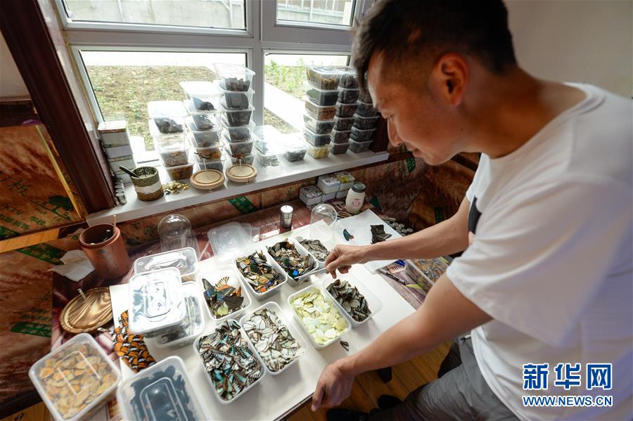 在吉木薩爾縣七彩蝶園,關(guān)富云在挑選制作蝶翅畫(huà)所需的蝴蝶翅膀(5月15日攝)。新華社記者丁磊攝