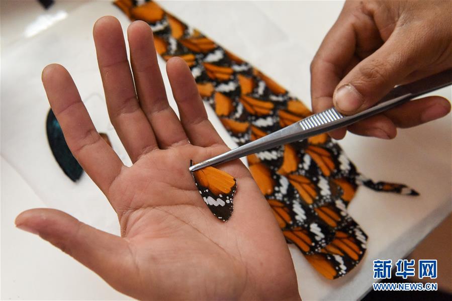 在吉木薩爾縣七彩蝶園,關(guān)富云在制作蝶翅畫(5月14日攝)。新華社記者丁磊攝