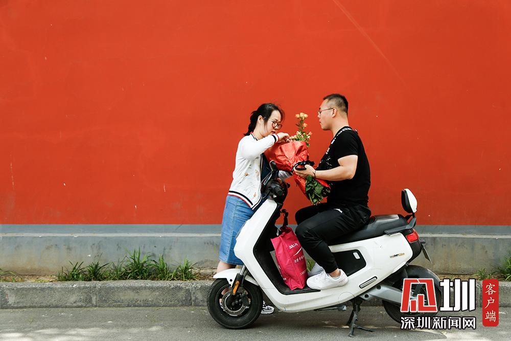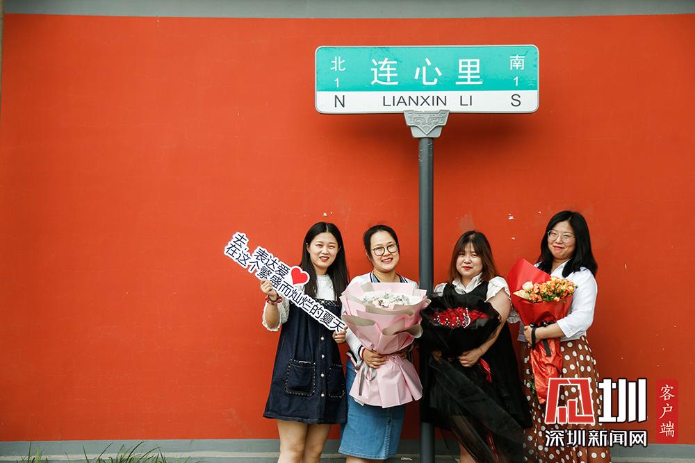 不過(guò),在5月20日當(dāng)天來(lái)這里拍照的情侶或夫妻并不多,反倒有眾多“單身狗”與同性閨蜜一起,在“連心里”的路牌下、紅墻邊,手捧鮮花拍照打卡。