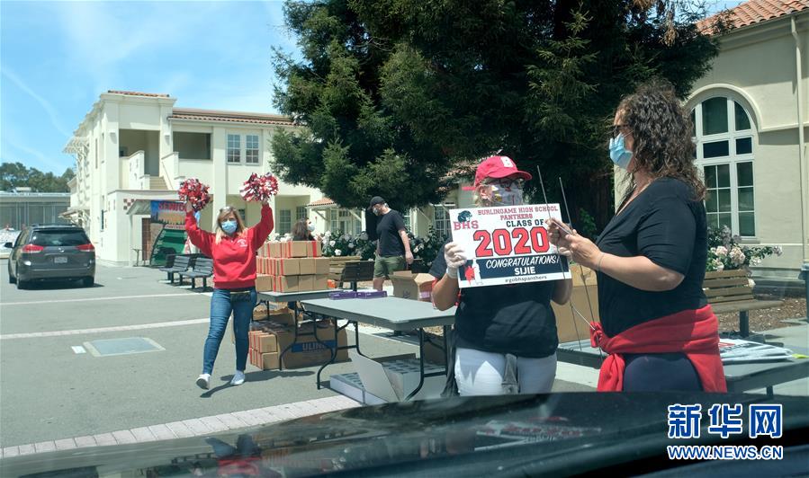 5月22日,在美國(guó)加州北部圣馬特奧縣,人們歡迎來辦理畢業(yè)手續(xù)的學(xué)生。新華社記者吳曉凌攝
