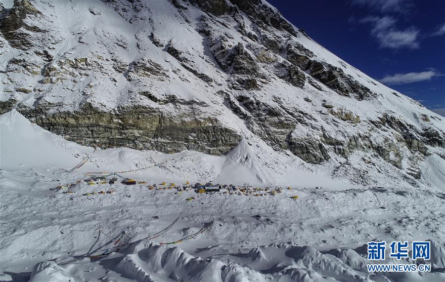 位于珠峰東絨布冰川旁海拔6500米的珠峰前進(jìn)營(yíng)地(5月22日攝,無(wú)人機(jī)照片)。新華社記者晉美多吉攝