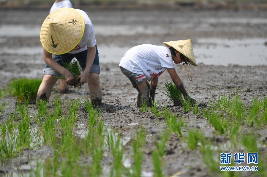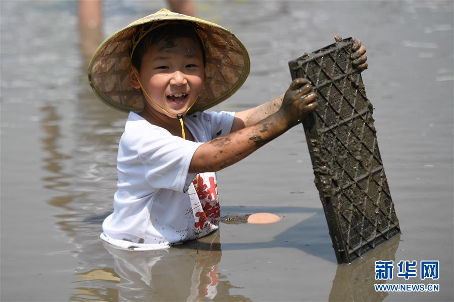 5月24日,一名小朋友在稻田里插秧。當(dāng)日,十余名小朋友在家長(zhǎng)的帶領(lǐng)下來(lái)到浙江省湖州市吳興區(qū)八里店鎮(zhèn)尹家圩糧油植保農(nóng)機(jī)專業(yè)合作社的稻田中,參加親子插秧、稻田捉魚等農(nóng)事體驗(yàn)活動(dòng)。新華社記者黃宗治攝