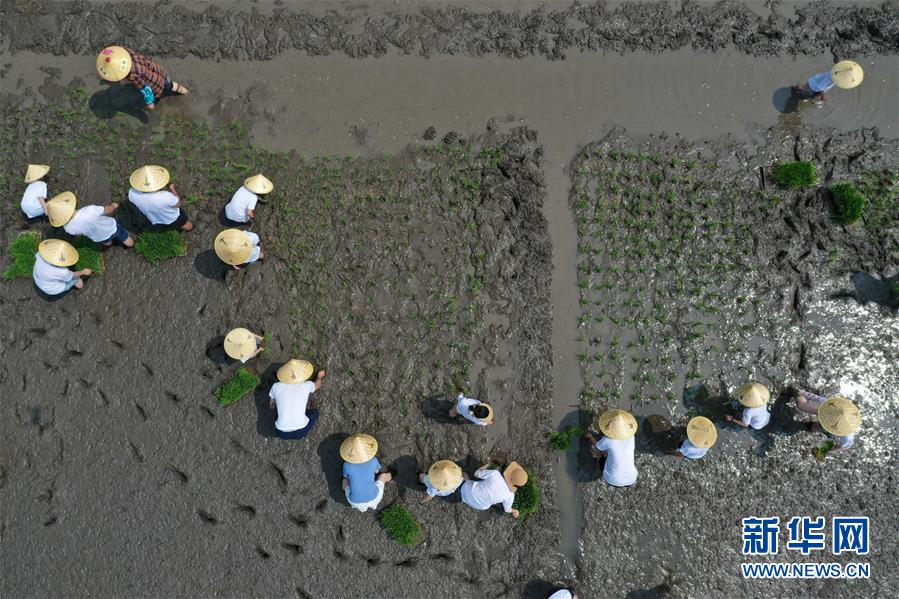 5月24日,小朋友與家長(zhǎng)在稻田里參加親子插秧比賽(無(wú)人機(jī)照片)。當(dāng)日,十余名小朋友在家長(zhǎng)的帶領(lǐng)下來(lái)到浙江省湖州市吳興區(qū)八里店鎮(zhèn)尹家圩糧油植保農(nóng)機(jī)專業(yè)合作社的稻田中,參加親子插秧、稻田捉魚等農(nóng)事體驗(yàn)活動(dòng)。新華社記者黃宗治攝