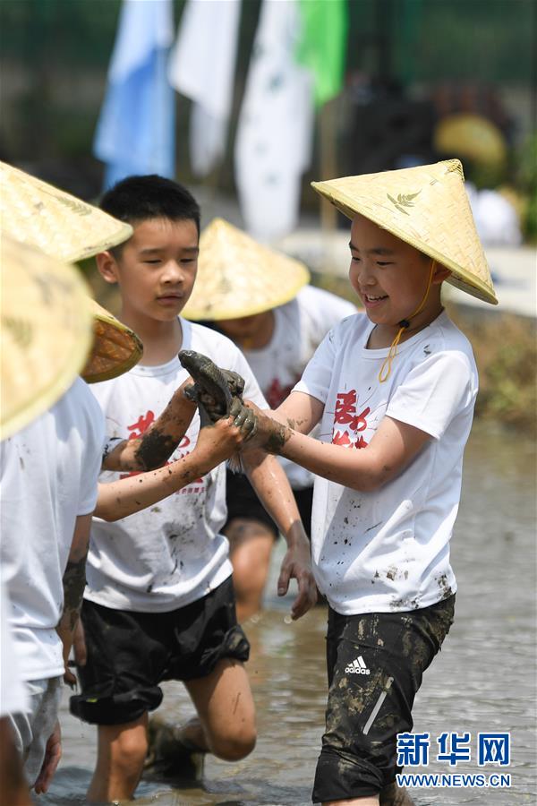 5月24日,小朋友在稻田里捉魚,體驗(yàn)農(nóng)事。當(dāng)日,十余名小朋友在家長(zhǎng)的帶領(lǐng)下來(lái)到浙江省湖州市吳興區(qū)八里店鎮(zhèn)尹家圩糧油植保農(nóng)機(jī)專業(yè)合作社的稻田中,參加親子插秧、稻田捉魚等農(nóng)事體驗(yàn)活動(dòng)。新華社記者黃宗治攝