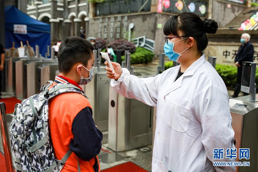 5月25日,貴陽市中天北京小學(xué)未來方舟校區(qū)學(xué)生在返校時進(jìn)行體溫檢測。新華社記者歐東衢攝