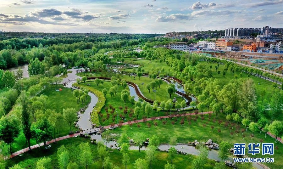 5月24日拍攝的榆林市榆溪河生態(tài)長(zhǎng)廊(無(wú)人機(jī)照片)。新華社記者陶明攝