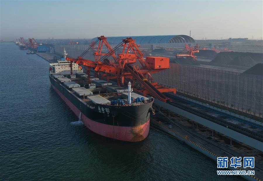 5月22日,一艘輪船靠泊在唐山港曹妃甸港區(qū)煤碼頭三期工程的先期工程泊位裝貨(無人機(jī)照片)。