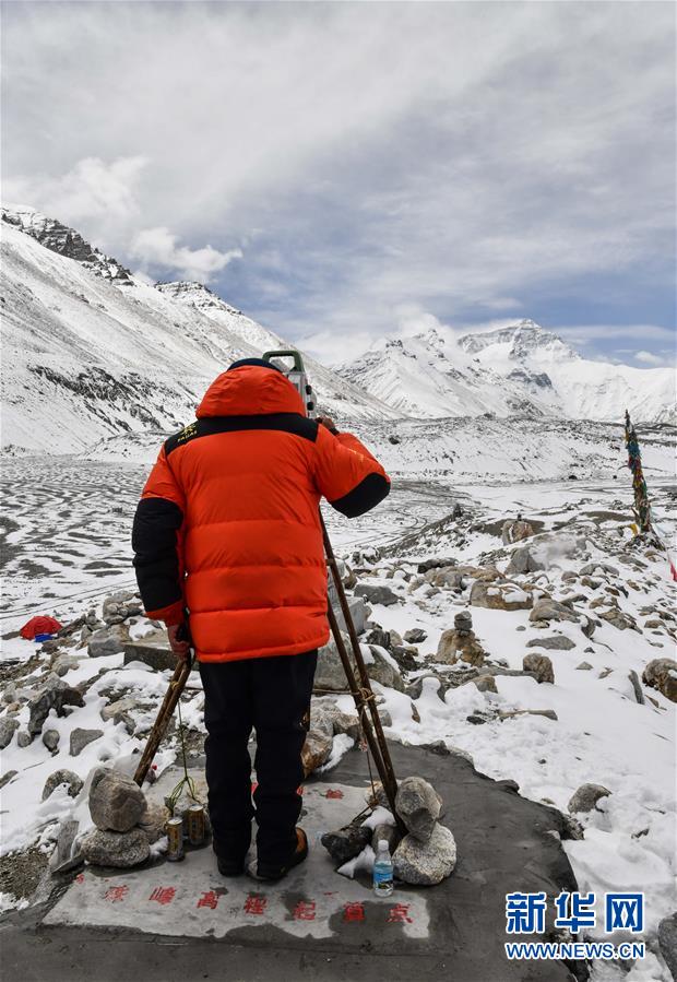 自然資源部第一大地測量隊(duì)隊(duì)員鄭林在使用全站儀對珠峰峰頂進(jìn)行交會觀測(5月27日攝)。新華社記者普布扎西攝
