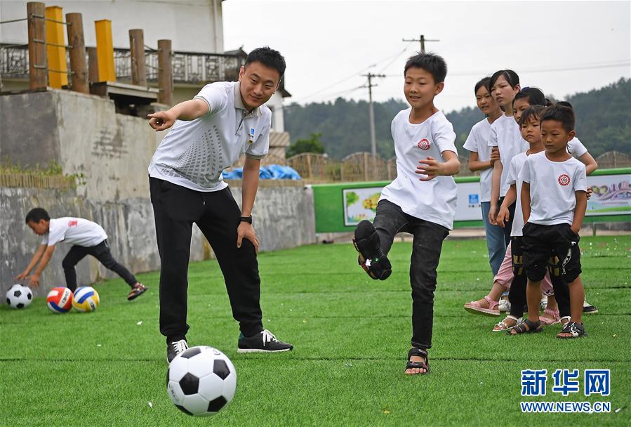 5月27日,在江西省貴溪市金屯鎮(zhèn)金屯村渡坊村小組,志愿者和留守兒童一起進(jìn)行體育活動。新華社記者萬象攝