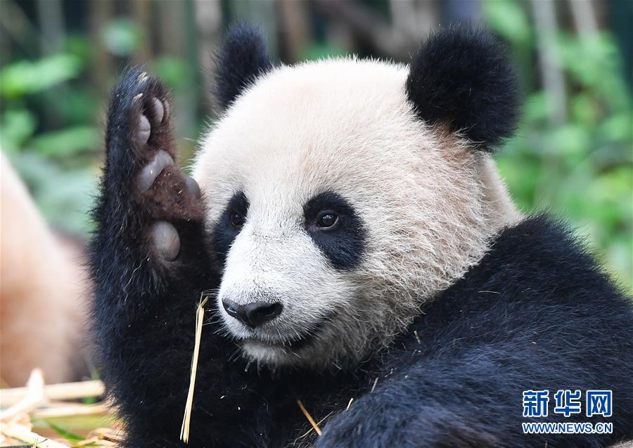 5月27日,被搶走竹子的大熊貓婷仔“舉手”望向飼養(yǎng)員。正在享受竹子大餐的廣州長隆野生動物世界大熊貓婷仔被大熊貓隆仔搶食,兩只大熊貓上演一場爭食戲碼。新華社記者劉大偉攝