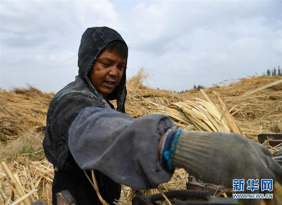 5月20日,在新疆博湖縣西南河口葦場(chǎng),工人將蘆葦打包。新華社記者宋彥樺攝