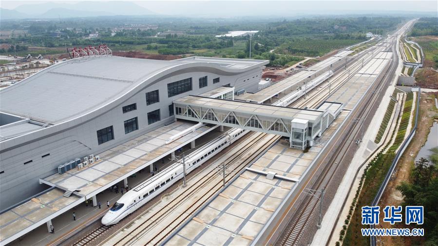 5月27日,試運(yùn)行檢查確認(rèn)列車??吭谏毯虾几哞F安吉站(無(wú)人機(jī)照片)。新華社記者張端攝