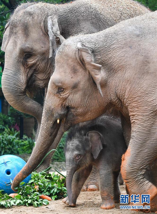 5月27日,廣州長隆的新生亞洲象寶寶與媽媽寸步不離。新華社記者劉大偉攝