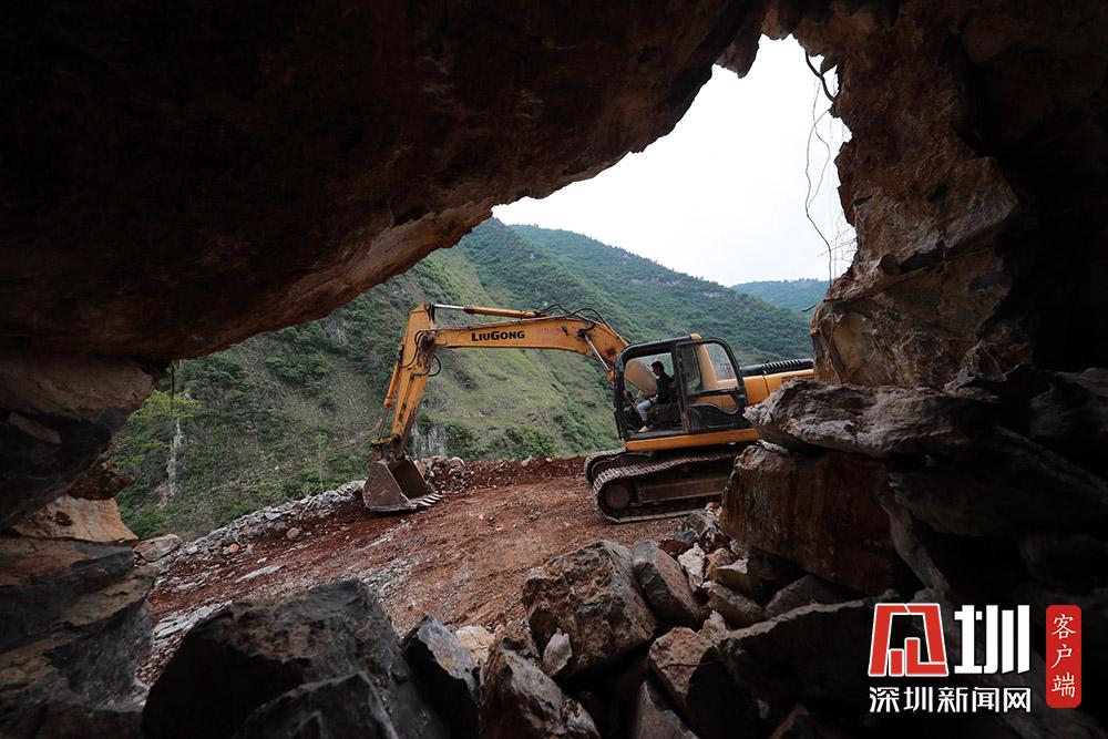 2020年5月27日,在貴州省畢節(jié)市納雍縣化作鄉(xiāng)雙巖頭村,挖掘機在觀音巖的懸崖邊修路。