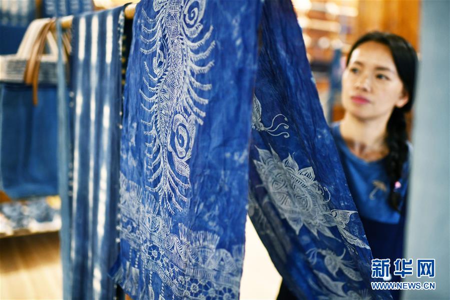 2018年,楊成蘭在村里成立傳統(tǒng)織染合作社,吸引村里及周邊村寨貧困戶入股,帶動當(dāng)?shù)刎毨艉痛迕窦尤牒献魃纾瑥氖驴棽?、染布、藍(lán)靛種植等產(chǎn)業(yè),在傳承民族傳統(tǒng)手工技藝的同時,幫助村民脫貧增收。新華社記者楊文斌攝