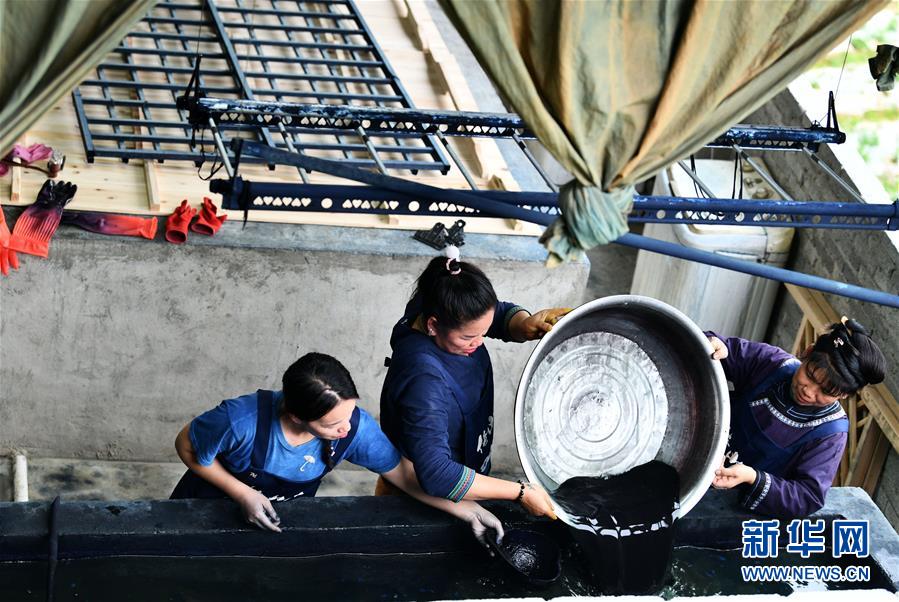 2018年,楊成蘭在村里成立傳統(tǒng)織染合作社,吸引村里及周邊村寨貧困戶入股,帶動(dòng)當(dāng)?shù)刎毨艉痛迕窦尤牒献魃纾瑥氖驴棽?、染布、藍(lán)靛種植等產(chǎn)業(yè),在傳承民族傳統(tǒng)手工技藝的同時(shí),幫助村民脫貧增收。新華社記者楊文斌攝