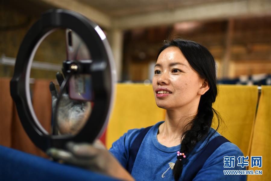 楊成蘭在用手機(jī)對(duì)侗族土布植物染色技藝進(jìn)行網(wǎng)絡(luò)直播(5月28日攝)。