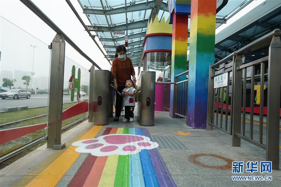 5月31日,乘客在南京市建鄴區(qū)河西新城有軌電車友誼街站候車?!傲弧眹H兒童節(jié)前夕,江蘇省南京市建鄴區(qū)河西新城有軌電車友誼街站裝扮一新,站臺上的城堡、熱氣球等充滿童趣的元素讓乘客仿佛置身“童話世界”。該站臨近南京市兒童醫(yī)院河西院區(qū),家長和兒童乘客較多。新華社記者季春鵬攝