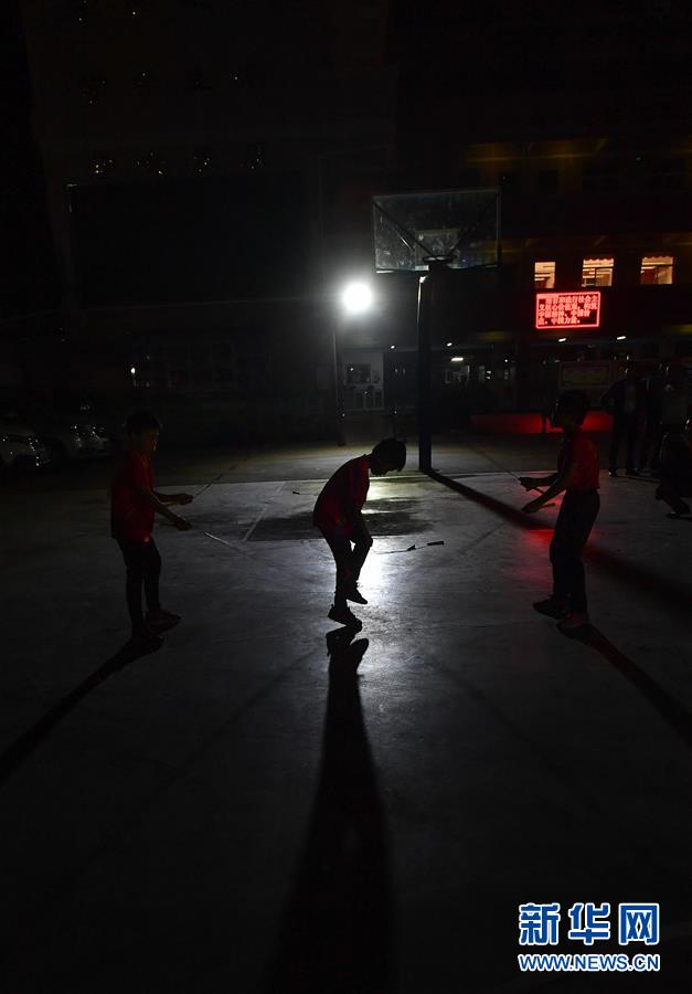 鐘煒鋒在校園小廣場(chǎng)上和同學(xué)練跳繩,當(dāng)天晚上,電影《點(diǎn)點(diǎn)星光》將在七星小學(xué)操場(chǎng)上舉行首映式(2019年11月15日攝)。新華社記者劉大偉攝