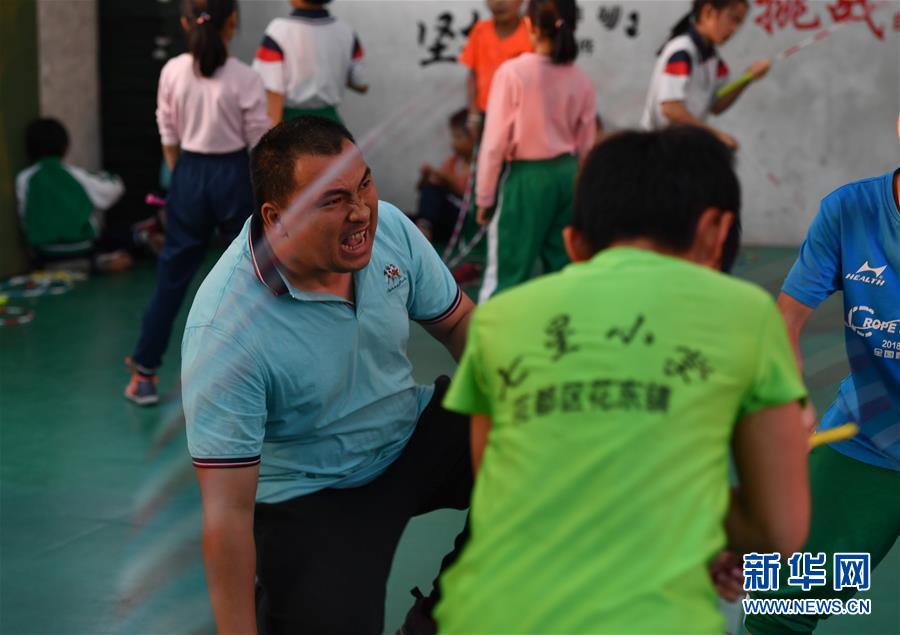七星小學(xué)跳繩隊(duì)教練賴(lài)宣治(左)正大吼著激勵(lì)隊(duì)員訓(xùn)練。正是這位沒(méi)有接觸過(guò)專(zhuān)業(yè)跳繩訓(xùn)練的的體育老師把跳繩運(yùn)動(dòng)引入學(xué)校,十年不懈,領(lǐng)著孩子們從鄉(xiāng)村的小操場(chǎng)跳到世界的大舞臺(tái)(2019年11月18日攝)。新華社記者劉大偉攝