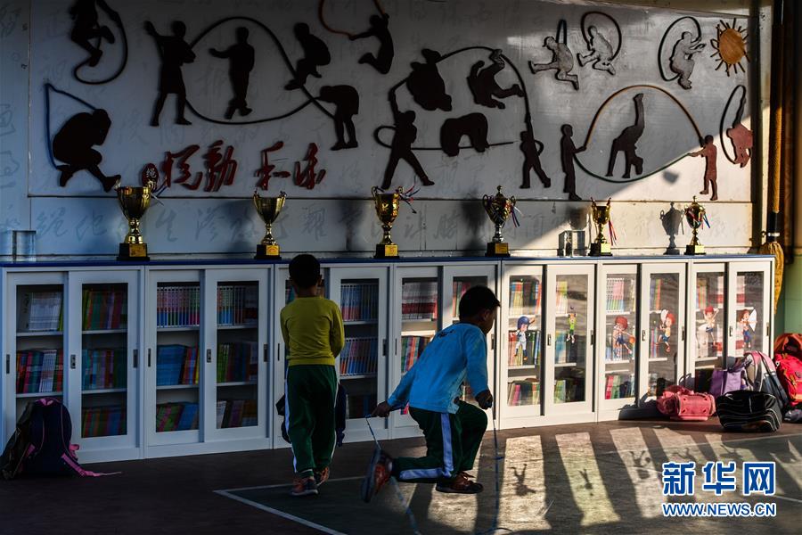 鐘煒?shù)h在校園小廣場(chǎng)上和同學(xué)練跳繩,當(dāng)天晚上,電影《點(diǎn)點(diǎn)星光》將在七星小學(xué)操場(chǎng)上舉行首映式(2019年11月15日攝)。新華社記者劉大偉攝