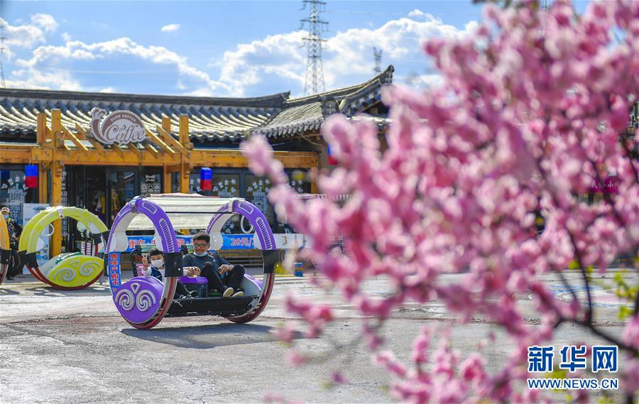 在延邊朝鮮族自治州和龍市“金達萊”民俗村,村民在村內的咖啡館前體驗親子游樂項目(5月6日攝)。新華社記者許暢攝。