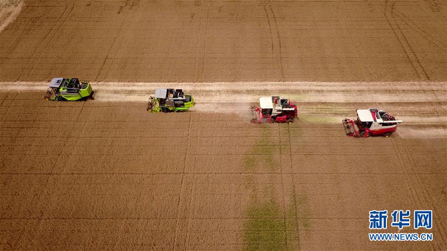 6月3日,在汶上縣郭倉鎮(zhèn),收割機(jī)在收獲小麥(無人機(jī)航拍)。目前,我國第二大小麥主產(chǎn)區(qū)山東6000多萬畝小麥進(jìn)入收獲階段。農(nóng)民們搶抓有利天氣,自南向北陸續(xù)開鐮。新華社記者郭緒雷攝。