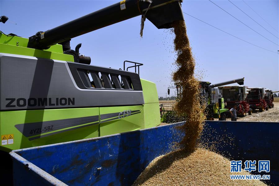 6月3日,在汶上縣郭倉鎮(zhèn),收割機(jī)在收獲小麥。目前,我國第二大小麥主產(chǎn)區(qū)山東6000多萬畝小麥進(jìn)入收獲階段。農(nóng)民們搶抓有利天氣,自南向北陸續(xù)開鐮。新華社記者郭緒雷攝。